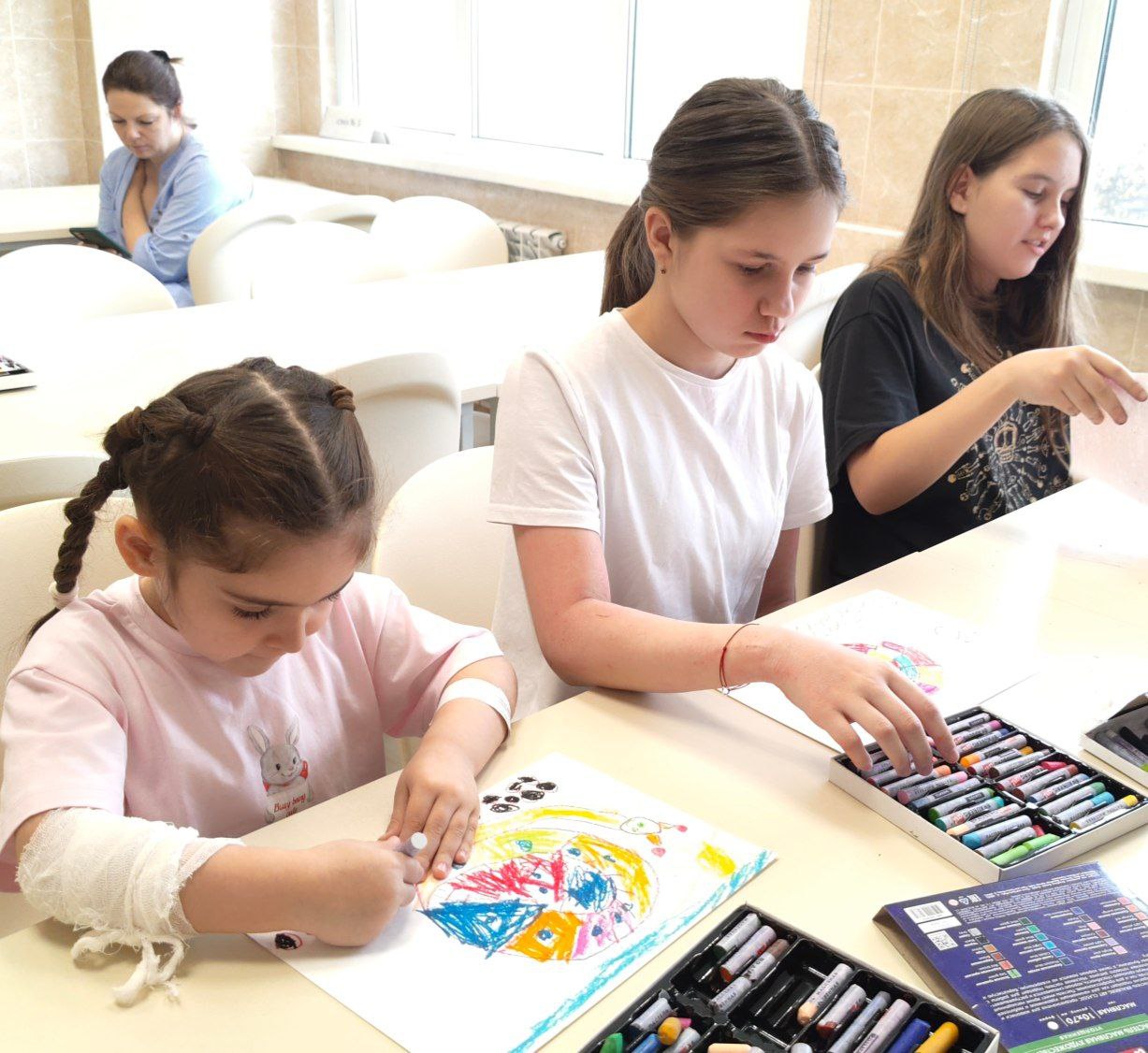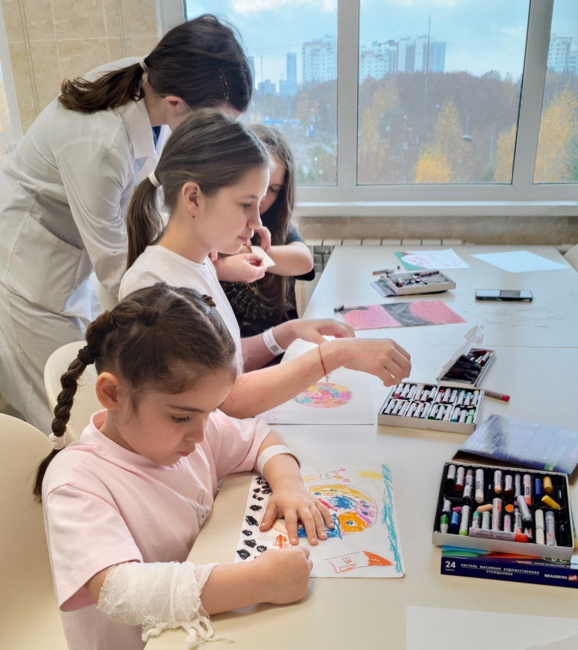 В гости к маленьким пациентам ДГКБ им. З.А. Башляевой вновь приехали наши большие друзья — Дворец творчества детей и молодежи «Неоткрытые острова». В этот раз детишек ждал мастер-класс по рисованию художественной пастелью.